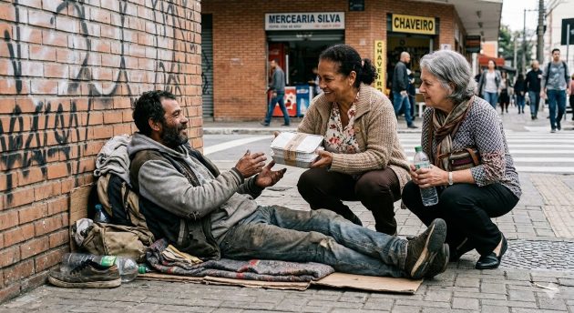 A lógica é exatamente a mesma. Você pega um morador de rua, a vizinhança adota, cada um contribui um pouquinho, um marmitex aqui, um agasalho ali em troca ele “presta serviço” pra comunidade. Ele fica ali, estrategicamente posicionado na esquina, impedindo que outros mendigos entrem na rua. Porque mendigo comunitário é territorial. Assim como o cão comunitário não deixa outro cachorro encostar, o mendigo comunitário olha torto pra qualquer concorrente que apareça. E as funções são basicamente as mesmas do vira-lata: Late, digo, grita caso outro mendigo se aproxime. Fica de guarda à noite, porque ele já tá acordado mesmo. O mendigo não dorme, ele só descansa. Há uma diferença filosófica importante aí. E se necessário… esfaqueia o meliante! Isso o cachorro não faz.