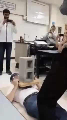 – Atenção, alunos, hoje vamos fazer ciência de verdade nesta sala de aula. Eu tenho esse machado e esse bloco. Eu vou bater o machado no bloco para vocês verem o que acontece. Preciso de um otário, digo, um voluntário pra ficar segurando o bloco debaixo dele enquanto eu bato o machado. Quem se candidata??