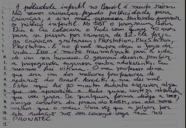 “A publicidade infantil no Brasil é muito ruim. Não vemos crianças fazendo propagandas para crianças, e sim anões japoneses tentando enganar o público infantil. No SBT o programa Bom Dia e Cia. colocava o Yudi com quase quarenta anos para se passar por criança de 12. Ele fazia as crianças gritarem Playstation, Playstation, Playstation. E no final sempre dava o Jogo da Vida. Isso é muito traumatizante para a vida de um ser humano. O governo deveria proibir a propaganda enganosa contra adolescentes. Eu mesmo fui vítima. O meu professor disse que era um dos melhores professores de redação do Brasil. Acreditei e me dei mal. Estou aqui há 30 minutos tentando escrever algo que se aproveite e tenho quase que certeza absoluta que vou zerar. De qualquer forma desejo a você, amigo corretor de redação do ENEM, um ano novo melhor que o meu. Uma vez que a julgar por esta redação não vou conseguir vaga nem no PRONATEC”.