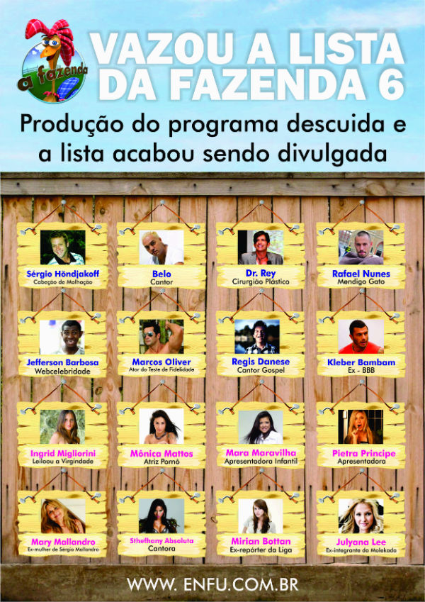 Desta vez Brito Jr. e Rodrigo Carelli (diretor do reality) não conseguiram preservar em sigilo o nome dos participantes da quinta temporada de ‘A Fazenda’. O nome chegou as redes sociais na manhã desta sexta-feira por meio de posts da Mhel Marrer, ex-redatora do programa Legendários, que teve acesso a lista de participantes na reunião de pauta chefiada por Marcos Mion. A reunião discutia as possibilidades de paródia que os novos fazendeiros ofereciam.